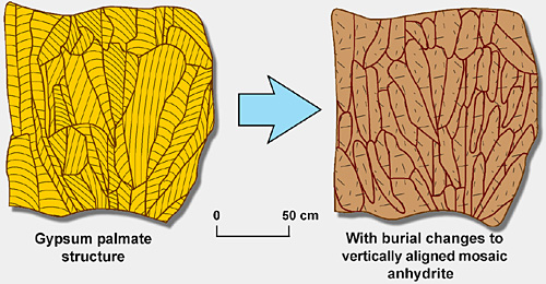 | Diagram demonstrating the transformation process from gypsum palmate (swallow tail) structure to anhydrite palmate structure (From Loucks and Longman, 1982 after Rouchy, 1976 and Orti and Shearmann, 1977). |