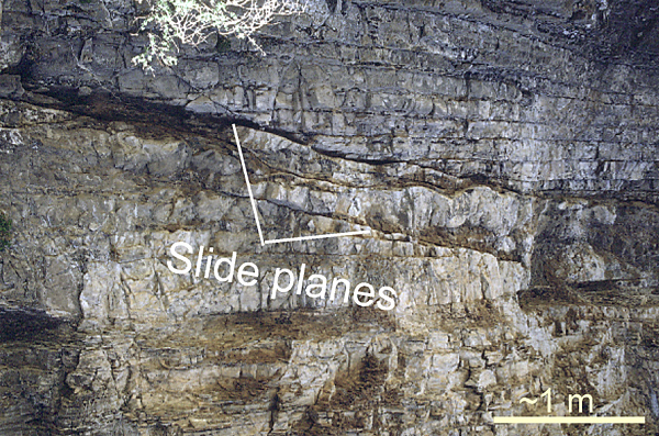 Soft-sediment slides in Permian-age slope carbonates from southeast New Mexico showing slide planes and convoluted bedding between slide planes.