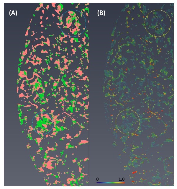 Oil recovery by water imbibition can be quantified through image analysis. Figure in the right shows the residual oil factor map (B) in water-imbibed and residual oil areas (A). Red and green in (A) denote the residual oil and water-imbibed areas, respectively. Scale bar in (B) is the residual oil factor after water imbibition from 0 to 1.0.