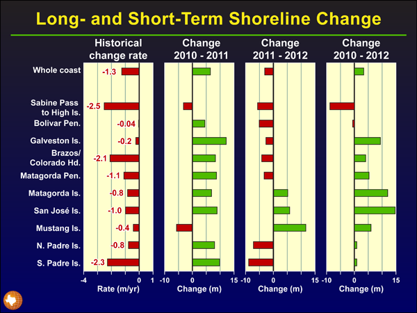 Figure 3. Comparison of incremental shoreline change measured between 2010 and 2012 with long-term shoreline change along the Texas Gulf shoreline.