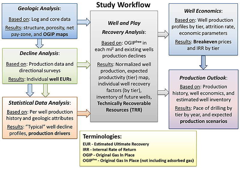 The Shale Production and Reserves Study, conducted by the Bureau of Economic Geology at The University of Texas at Austin, integrates engineering, geology, and economics in a numerical modeling approach that allows for scenario testing based on many input parameters. The first phase of the study, funded by the Alfred P. Sloan Foundation, investigated production from four major U.S. shale gas formations: Barnett, Fayetteville, Haynesville, and Marcellus. The Sloan Foundation provided a second grant for a second phase of the study, currently wrapping up the investigation of two major shale oil plays, the Bakken and the Eagle Ford.